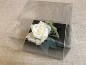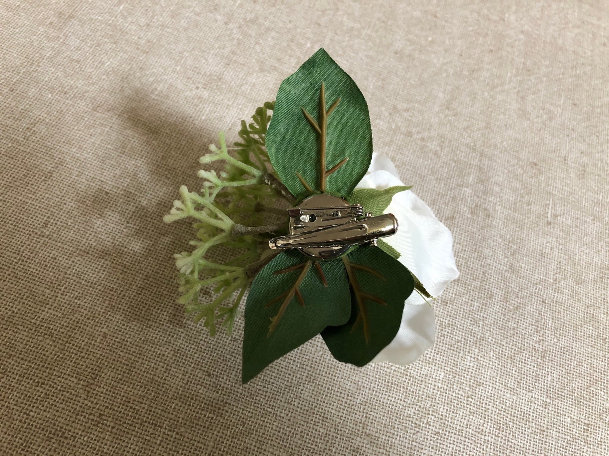 白いバラのアーティフィシャルフラワーのコサージュです。 卒業式や入学式の晴れの日に。 発表会の髪飾りとしてもお使い頂けます。 ケース入り。 サイズ約9cm